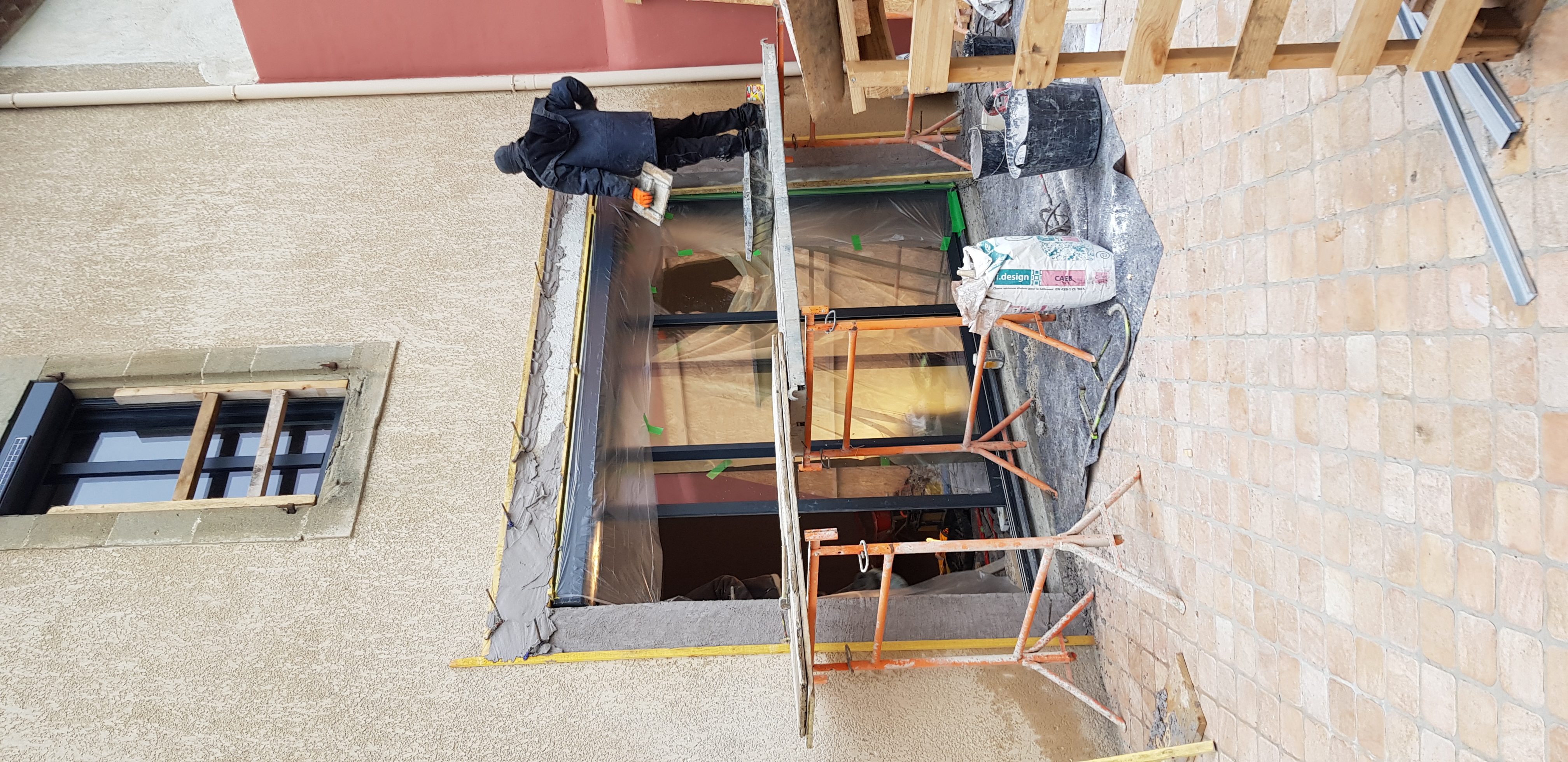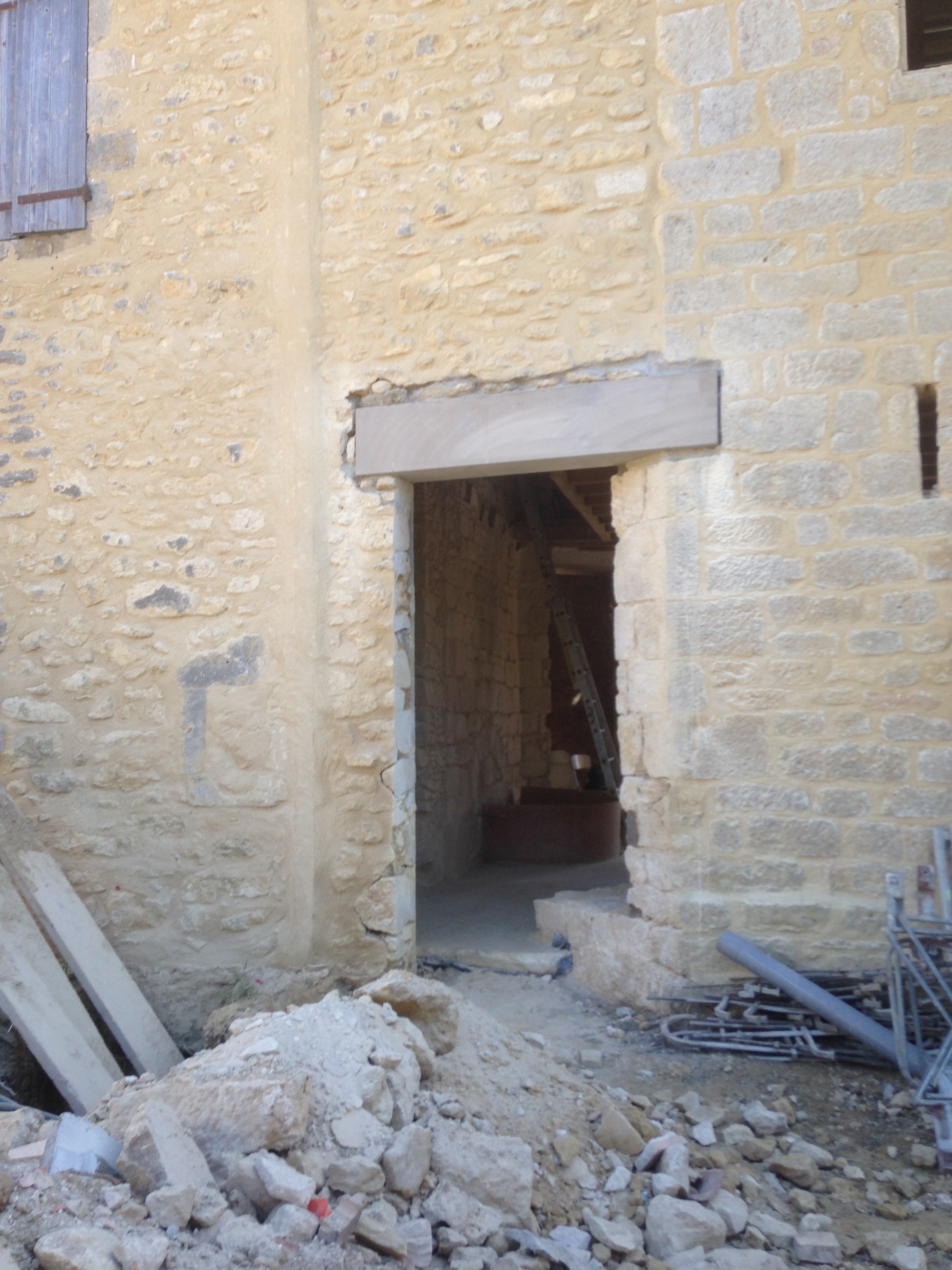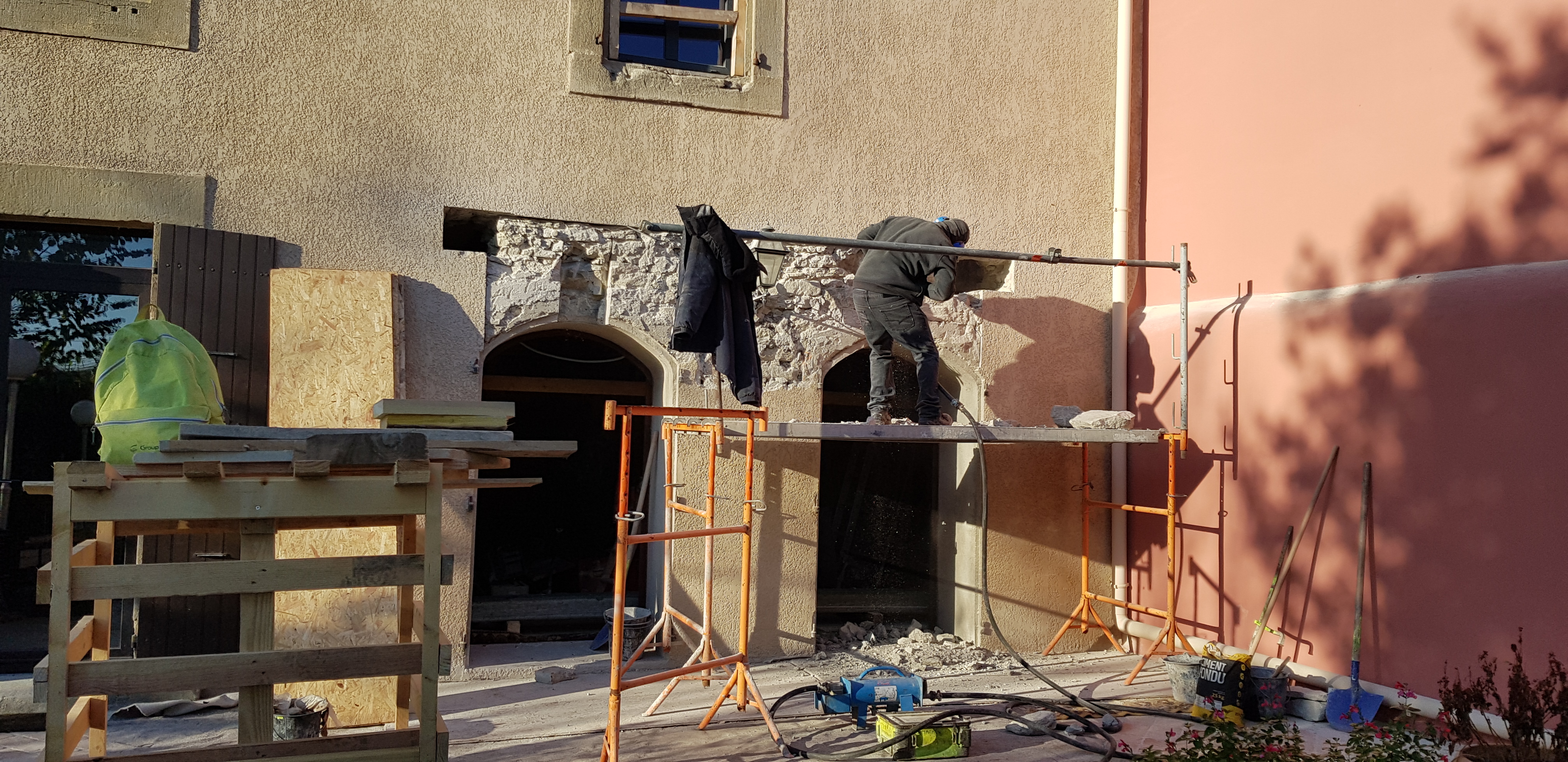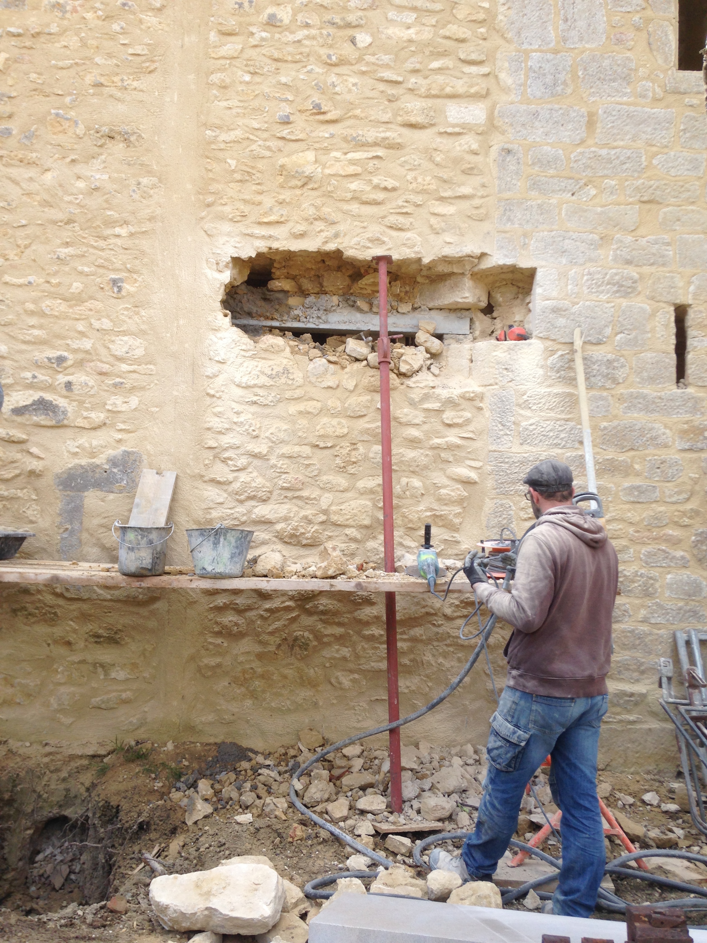 La création de fenêtres et portes dans les murs en pierre requiers une grande technicité, les murs anciens, dans notre région, sont souvent composés de pierres en grès très friable, et ils ont souvent été batis avec un mortier à base de terre, puis enduit au mortier de chaux. La réalisation d’ouverture à l’aide d’un marteau-piqueur peut les fragiliser, c’est la raison pour laquelle nous nous sommes équipés d’une découpeuse hydraulique à chaîne diamant qui permet des découpes précises et soignées .