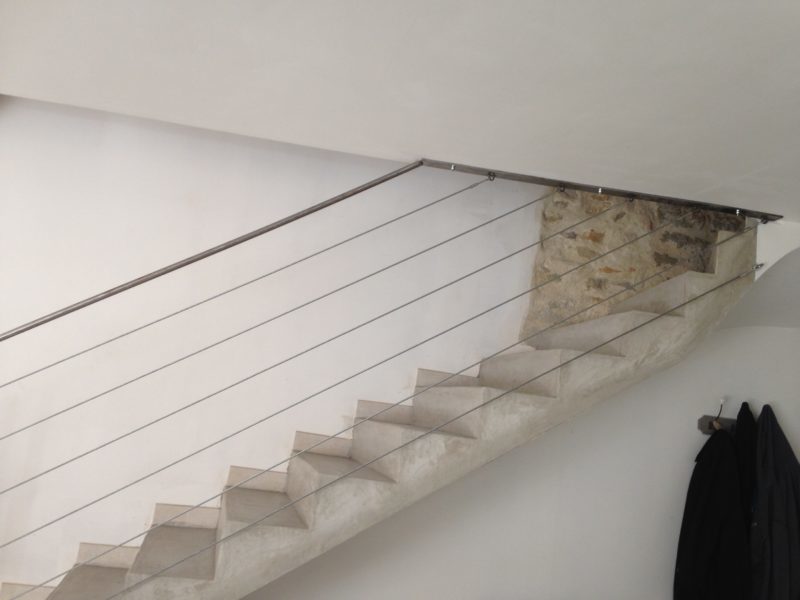 Cet escalier moderne a été pensé par les clients, la structure a donc été conçue par notre forgeron afin de supporter cet ouvrage extrêmement lourd. Nous avons réalisé un mur poids en béton armé dans lequel est venu se fixer l’escalier, le garde-corps est ici constitué de verre.